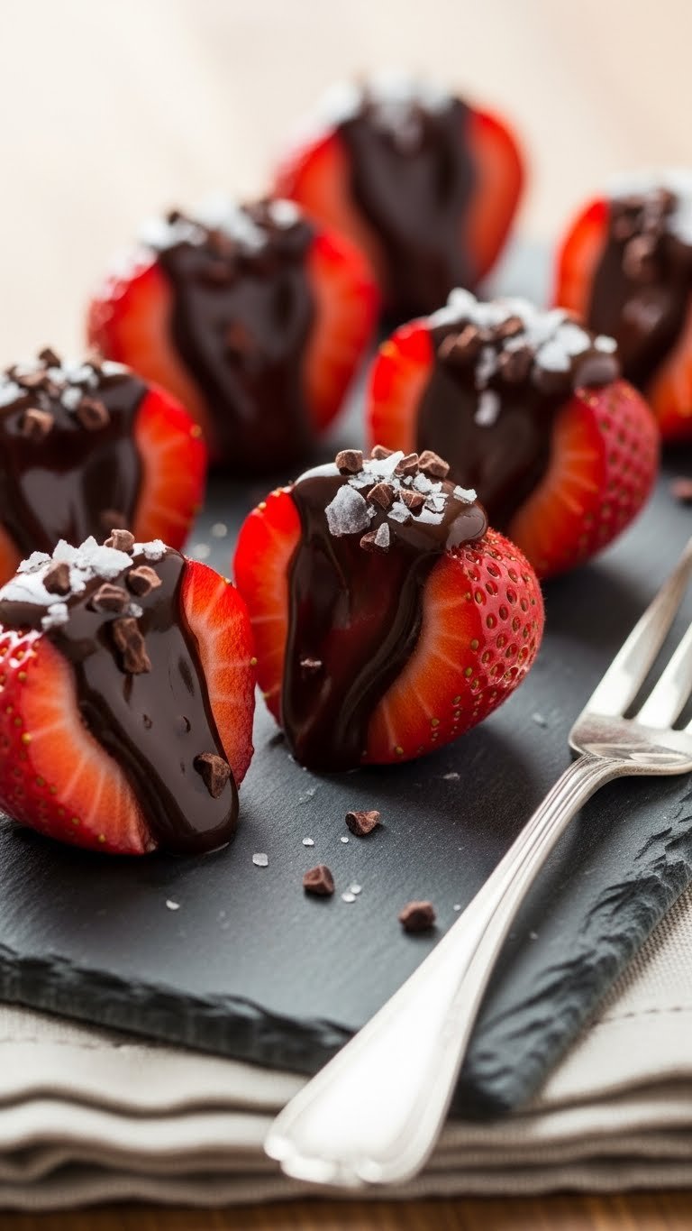 Serve on a dark slate or white platter for contrast. Garnish with extra cocoa nibs and a few whole strawberries. Pair with sparkling wine or espresso. Store in an airtight container in the fridge up to 2 days. Make ganache a day ahead and pipe just before serving to keep berries firm. Great for romantic or holiday gatherings.