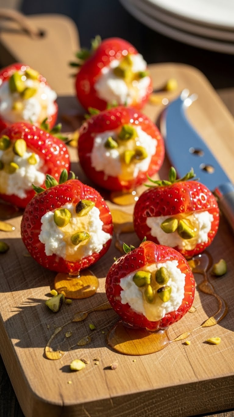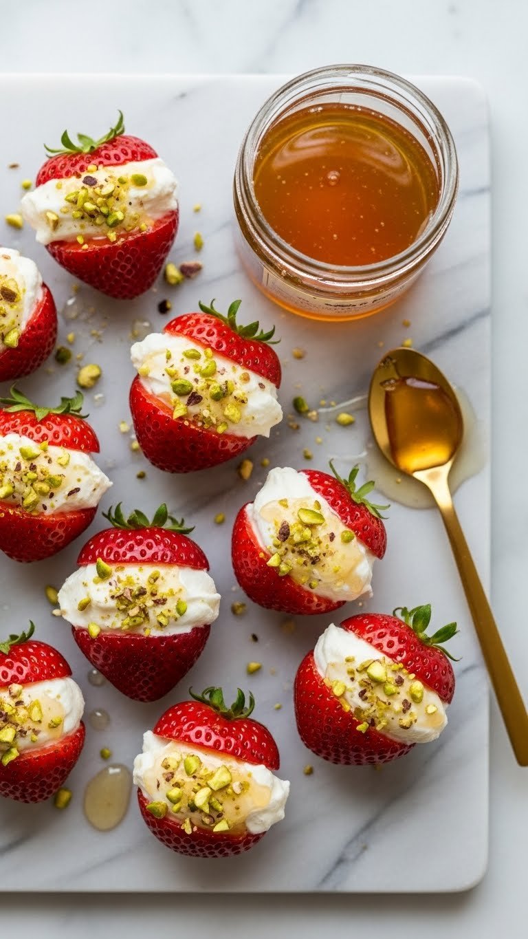 3. Mascarpone & Honey Pistachio Stuffed Strawberry (Creamy Crunch)