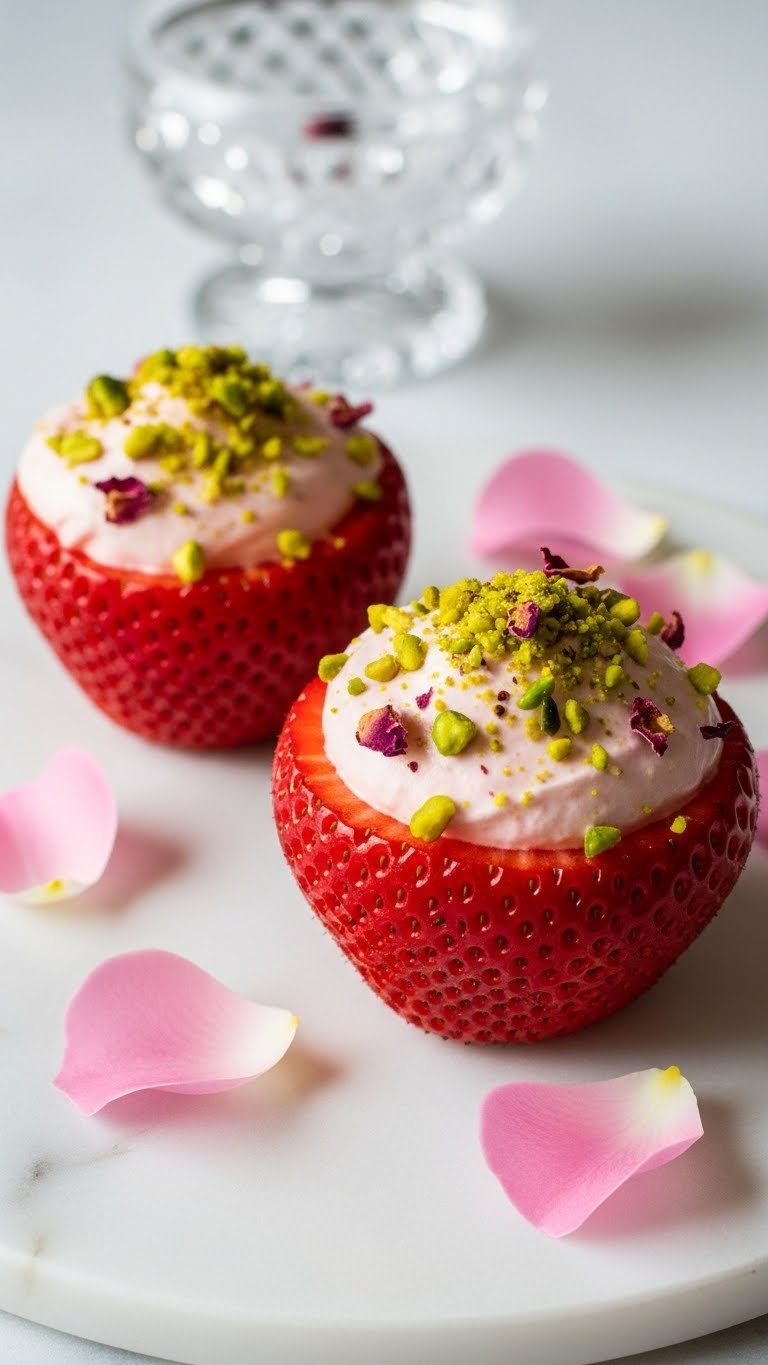 11. Rosewater Mascarpone & Pistachio Stuffed Strawberry (Delicate Floral Dessert)