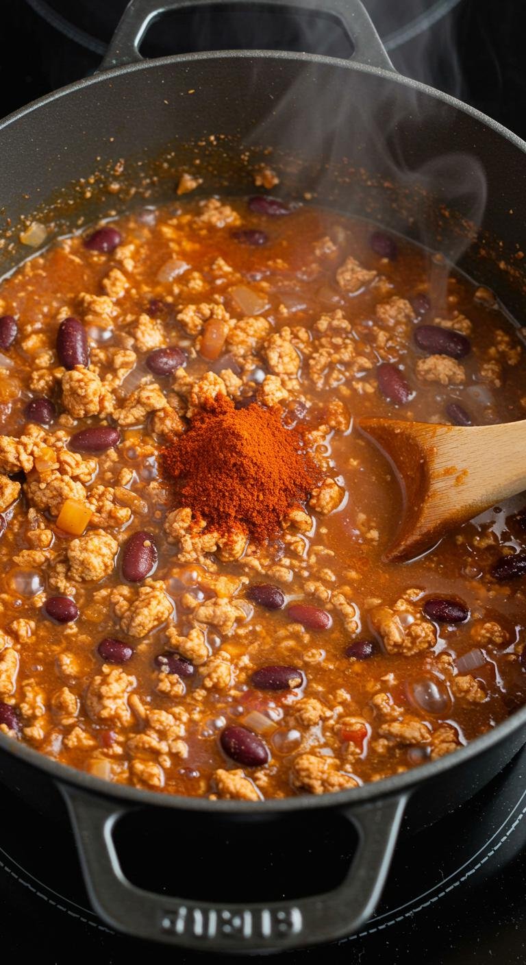 - Stir in tomato sauce and chili powder, simmer for 30 minutes.