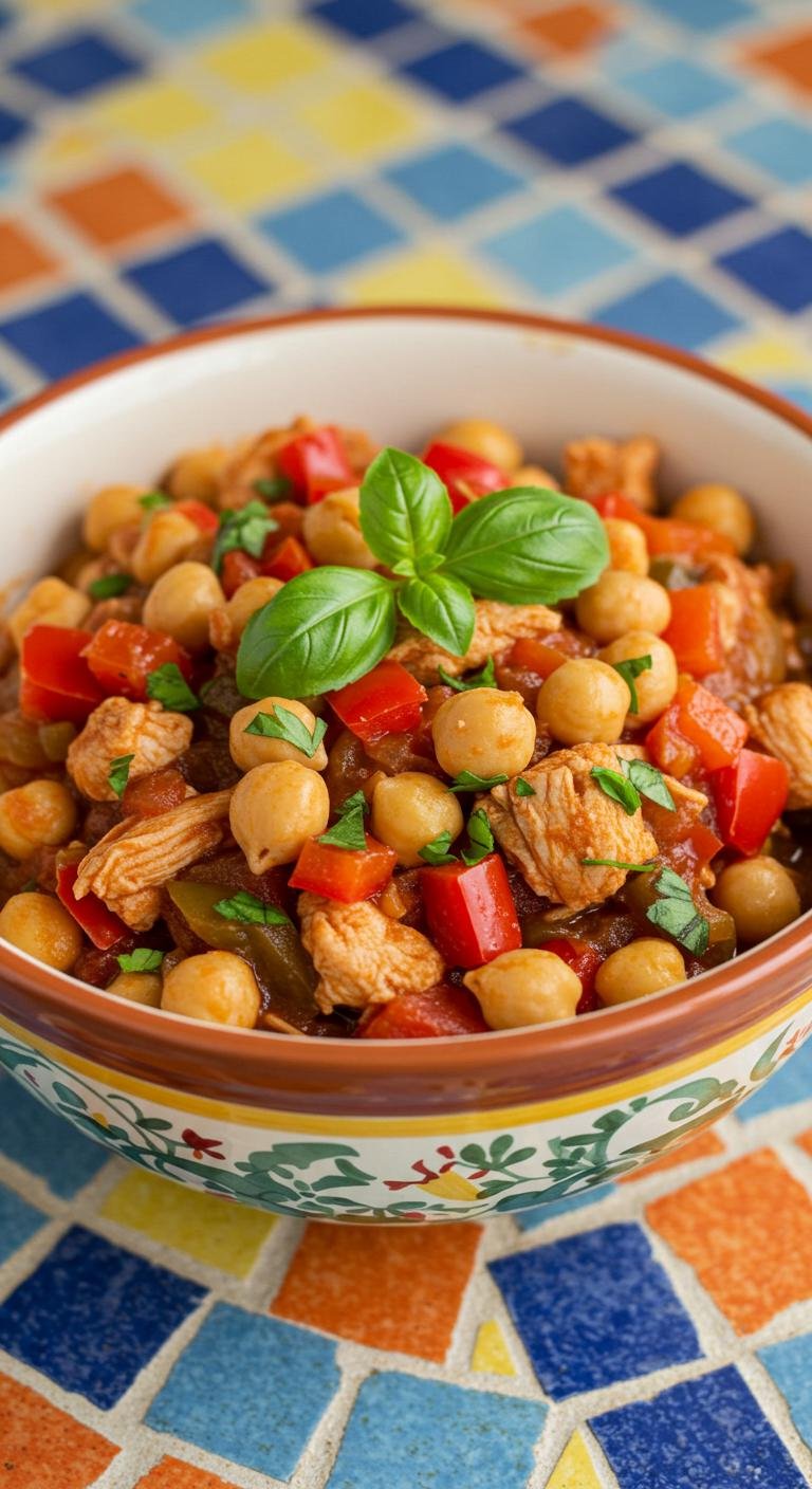 - Stir in chickpeas, peppers, tomatoes, and oregano.