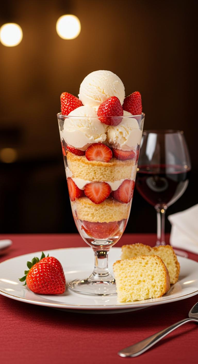 - Layer sponge cake, strawberry ice cream, and sliced strawberries in a glass.