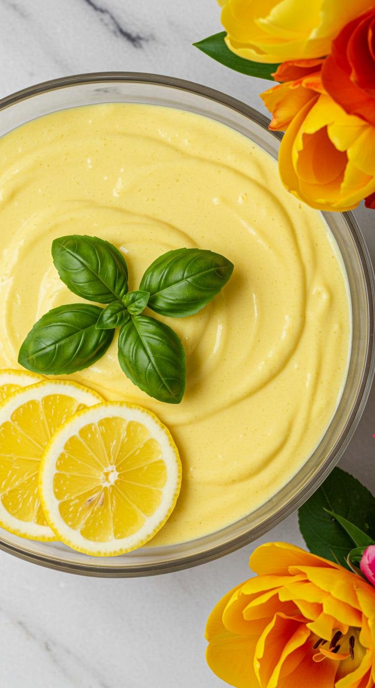 - Whip cream until soft peaks form; fold in the lemon mix and chopped basil.