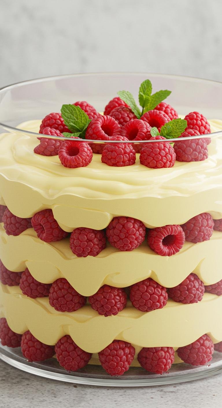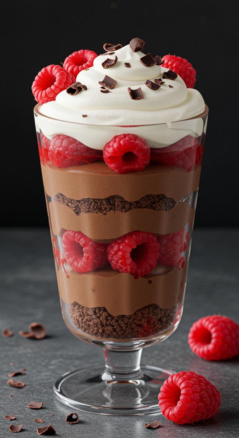 - Layer pudding, raspberries, and whipped cream in a glass.