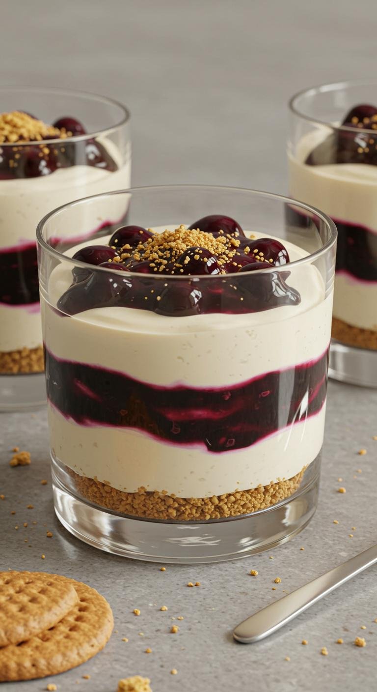 - Layer cheesecake filling and blueberry sauce in a glass.