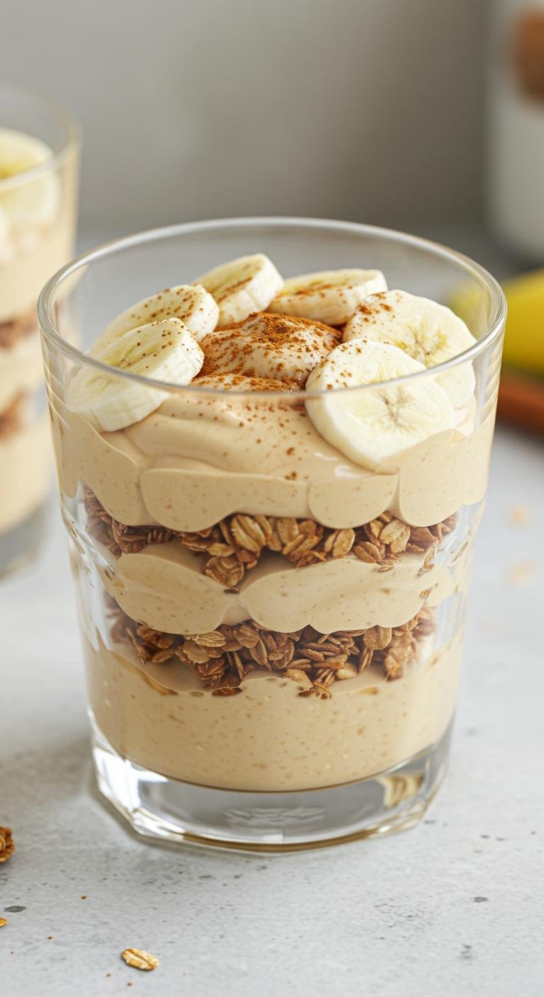 - Layer peanut butter yogurt, banana slices, and granola in a glass.