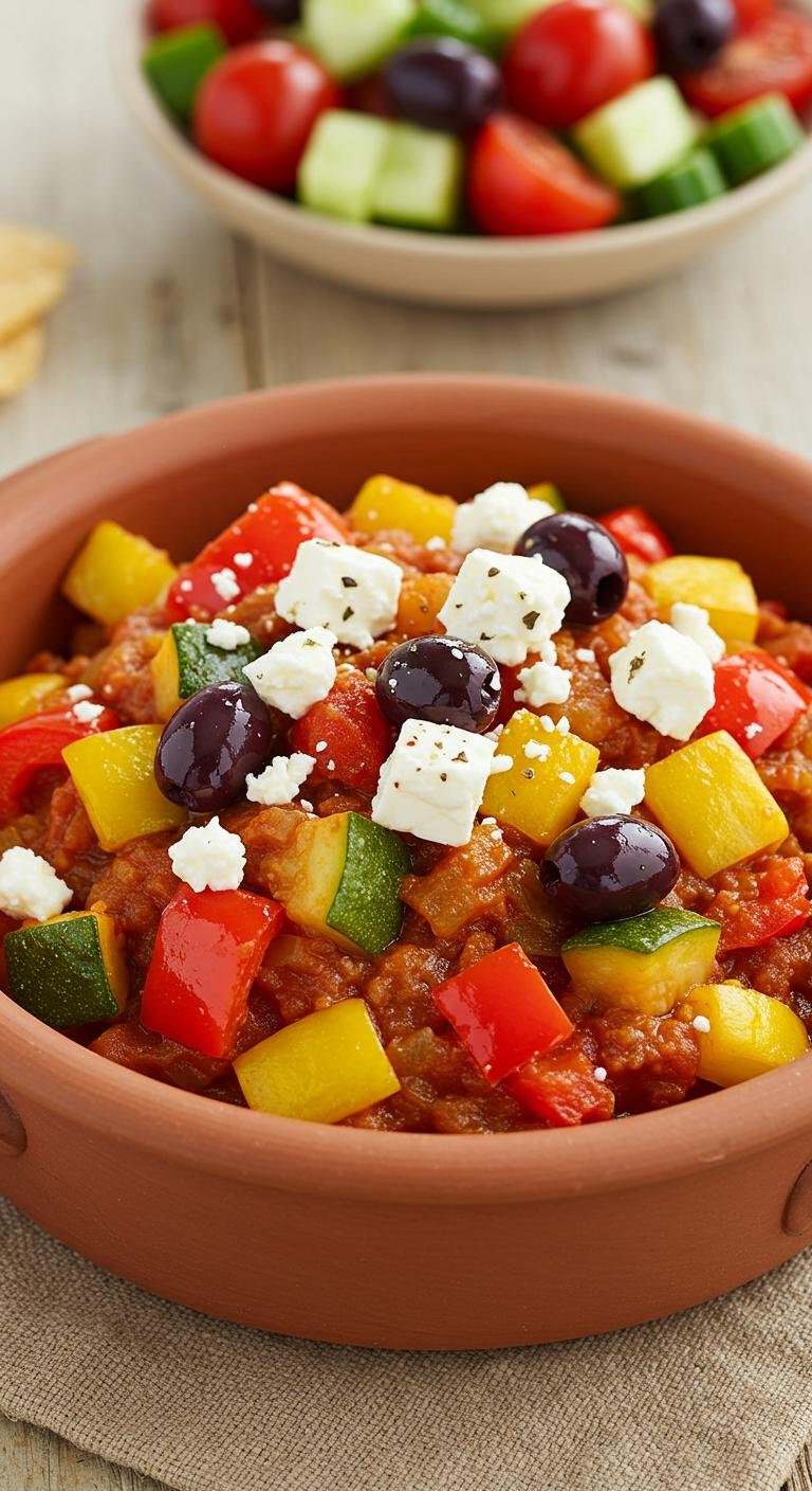 - In a pot, combine white beans, tomatoes, zucchini, bell pepper, olives, and oregano.