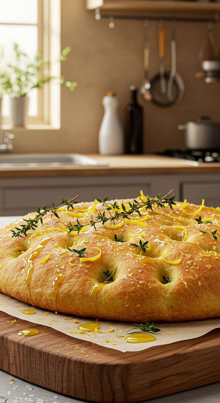 - Let rise, press into a baking tray, drizzle remaining oil, and bake at 425°F for 20 minutes.
