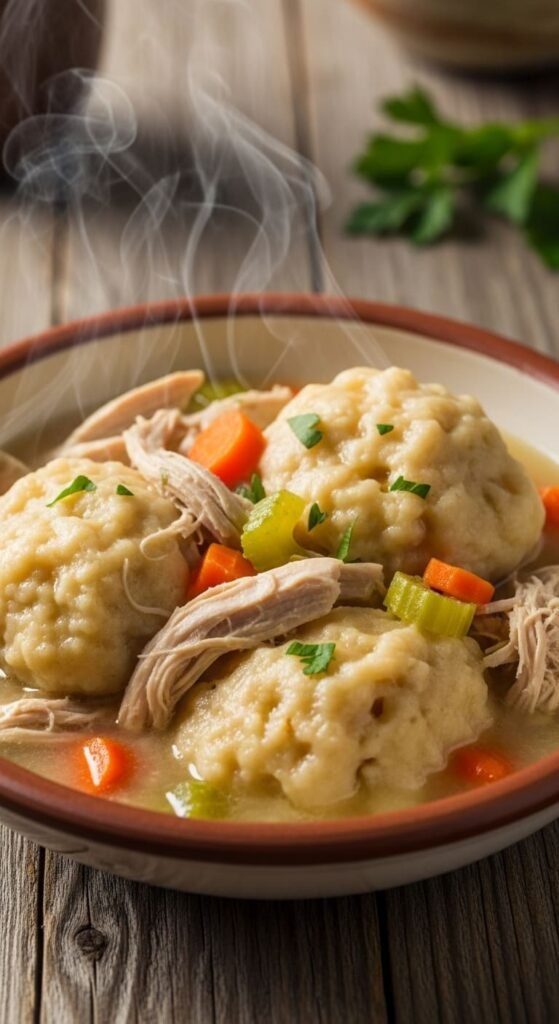 - Drop spoonfuls of dough into simmering broth; cook until dumplings rise.