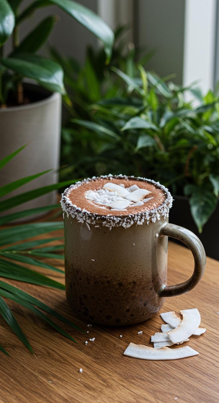 - Serve in a mug topped with shredded coconut.